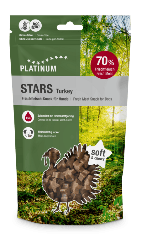 Spoznaj mehko nagrado iz pravega puranjega mesa, pripravljeno s FSG metodo, ki zagotavlja vrhunski okus in hranilnost. Tvoj pes bo navdušen že po prvem grižljaju – PLATINUM Stars Turkey je popolna izbira za trening, nagrajevanje ali preprosto razvajanje.